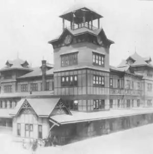 The Erie began developing the waterfront site in 1856.[3] The intermodal complex was open December 4, 1887.[4] Across the river-facing facade was New York, Lake Erie and Western Railroad, the name of the entity that built it, though it was also called Jersey City Terminal Station[5] or Erie Railroad Station The colloquial name is taken from the 17th century European settlement of Pavonia, New Netherland,[6] which began in the area and the ferry that served it. It has been described as "a brightly colored Victorian eclectic three story terminal located at the foot of Pavonia Avenue to serve a twelve track" station. It was designed by George E. Archer.[7] The end of track was at about 40.7266 N 74.0304 W. Besides the railroad, the complex was served by ferries, streetcars and the rapid transit Hudson and Manhattan Railroad (now PATH). The terminal was also used by New York, Susquehanna and Western Railway trains.[8] Long distance and suburban passenger trains reached the terminal by travelling through Bergen Hill via the Long Dock Tunnel and later under the Bergen Arches.[9]