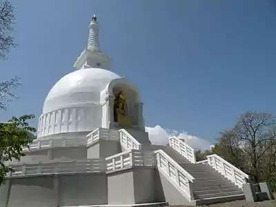 The Rajgir Vishwa Shanti Stupa/World Peace Pagoda (25.004553°N 85.444539°E) was completed in 1969 at Rajgir hills near Rajgir, near the Vulture's Peak where the Buddha is believed to have preached the Lotus Sutra.[3] The dedication coincided with the 100th anniversary of the birth of Mahatma Gandhi. The site also includes a Nipponzan Myohoji temple.[4]
