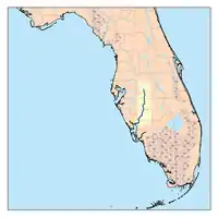 The Peace River is a river in the southwestern part of the Florida peninsula, in the U.S.A..[1] It originates at the juncture of Saddle Creek and Peace Creek northeast of Bartow in Polk County and flows south through Fort Meade (Polk County) Hardee County to Arcadia in DeSoto County and then southwest into the Charlotte Harbor estuary at Punta Gorda in Charlotte County. It is 106 miles (171 km) long and has a drainage basin of 1,367 square miles (3,540 km2). U.S. Highway 17 runs near and somewhat parallel to the river for much of its course. The river was called Rio de la Paz (River of Peace) on 16th century Spanish charts.[2] It appeared as Peas Creek or Pease Creek on later maps. The Creek (and later, Seminole) Indians call it Talakchopcohatchee, River of Long Peas.[3] Other cities along the Peace River include Fort Meade, Wauchula and Zolfo Springs.[4]