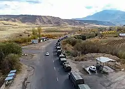 The Russian peacekeeping forces, provided by the 15th Separate Motor Rifle Brigade of the Russian Ground Forces,[13] consisting of 1,960 servicemen,[14] and led by Lieutenant General Rustam Muradov, were dispatched to the region as part of the ceasefire agreement to monitor compliance by Armenia and Azerbaijan with its terms.[15] The peacekeeping forces, headquartered near Stepanakert, established observation posts along the contact line in Nagorno-Karabakh and along the Lachin corridor.[16] Reuters reported that the peacekeeping forces were accompanied with armoured personnel carriers, tanks and multiple rocket launchers.[17] On 17 November, the Russian peacekeeping forces started to assist the International Committee of the Red Cross on finding and exchanging the bodies of the fallen soldiers from both sides,[18] and on 23 November, started demining operations in the region.[19]
