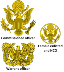 In the United States Army soldiers of ranks Specialist and below are not authorized to wear a combination cap and may only wear a beret with the blue service uniform. The combination cap for the blue service and blue dress uniforms of noncommissioned officers (Corporal and above) has a golden stripe on top of the cap band, black chinstrap; the device is the United States' coat of arms in front of a gold disk (the exception is the Sergeant Major of the Army whose device is a gold-colored rendering of the U.S coat of arms surrounded by a gold-coloured wreath). The version for warrant officers and company-grade officers (second lieutenants, first lieutenants, & captains) has a cap band with the branch-of-service color between two golden stripes, and a gold-colored chinstrap. Field-grade officers O-4 and Above (major, lieutenant colonel, and colonel) have oak leaves known unofficially as "scrambled eggs" on the visor. General officers' caps are similar to those of field-grade officers, but the cap band is dark blue and embroidered with gold oak leaf motifs. Warrant officers' cap device and all commissioned officers' cap device is a gold-color rendering of the United States' coat of arms, larger than that of soldiers and lacking the golden disk backing.