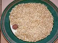 Pearl barley, or pearled barley, is whole grain barley that has been processed to remove its fibrous outer hull and polished to remove some or all of the bran layer.[1]
