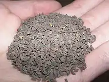 The seeds are colored dark brown[21] to blackish-brown,[2] slightly curved, triangular, about 2 mm (0.08 in) long with a muriculate surface.[2][21] The endosperm is oily.[26]