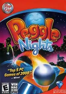 Peggle Nights is a Windows, Mac OS X and Microsoft Xbox Live Arcade[1] downloadable game from PopCap Games. Upon its release, PopCap marketed the game as a "follow-up" to Peggle,[2] although an actual sequel to the 2007 PC Game was released in 2013. The gameplay between Peggle and Peggle Nights has remained largely unchanged, with each stage featuring a colorful 2D background filled with different colored "pegs". The objective in each level is to clear all of the orange pegs by hitting them with a ball shot from the top of the screen. New to this version are 60 new levels, 60 additional challenges, the introduction of the new Peggle Master Marina the Electric Squid, and the addition of an "Aced" score for each level.