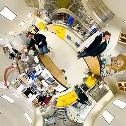 The Peirce quincuncial projection[1] is a conformal map projection developed by Charles Sanders Peirce in 1879. The projection has the distinctive property that it can be tiled ad infinitum on the plane, with edge-crossings being completely smooth except for four singular points per tile. The projection has seen use in digital photography for portraying 360° views. The description quincuncial refers to the arrangement of four quadrants of the globe around the center hemisphere in an overall square pattern. Typically the projection is oriented such that the north pole lies at the center.