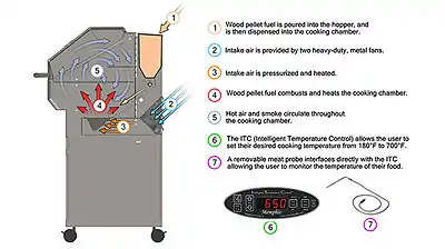 First, the desired temperature is programmed into the electronic control panel. A motor-driven auger then feeds a small amount of pellets from the hopper to the fire pot. Igniter rods light the pellets and prime the fire, raising the grill to an initial starting temperature of 140 °F (60 °C) to 180 °F (82 °C), depending on the manufacturer. Once the fire is ready, the desired temperature is achieved via a repeated duty cycle, which represents a segment of time when the auger is active and idle. A single duty cycle starts when the auger turns on and begins feeding pellets then continues through the period when it shuts off and remains idle. The duty cycle ends when the auger turns on again. For example, a pellet grill set to 250 °F (121 °C) might have an auger-on period of 10 seconds followed by an auger-off period of 50 seconds. Duty cycles are typically stated as a percentage that represents the amount of time the auger is running—an auger that's always on has a 100% duty cycle, while one that is on half the time has a 50% duty cycle.[12] Each temperature setting has a different duty cycle. However, regardless of that temperature setting, the auger-on portion of the duty cycle remains constant. The auger-off period is the variable. Lower temperatures have longer auger-off periods, while high temperatures have shorter.