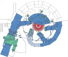 A Pelton wheel is an impulse-type water turbine invented by American inventor Lester Allan Pelton in the 1870s.[1][2] The Pelton wheel extracts energy from the impulse of moving water, as opposed to water's dead weight like the traditional overshot water wheel. Many earlier variations of impulse turbines existed, but they were less efficient than Pelton's design. Water leaving those wheels typically still had high speed, carrying away much of the dynamic energy brought to the wheels. Pelton's paddle geometry was designed so that when the rim ran at half the speed of the water jet, the water left the wheel with very little speed; thus his design extracted almost all of the water's impulse energy—which allowed for a very efficient turbine.