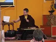 Chödrön teaches the traditional "Yarne"[15] retreat at Gampo Abbey each winter and the Guide to the Bodhisattva's Way of Life in Berkeley each summer.[5] A central theme of her teaching is the principle of "shenpa," or "attachment," which she interprets as the moment one is hooked into a cycle of habitual negative or self-destructive thoughts and actions. According to Chödrön, this occurs when something in the present stimulates a reaction to a past experience.[5]