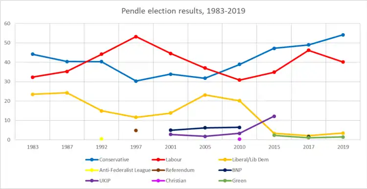 Pendle is a constituency[n 1] represented in the House of Commons of the UK Parliament since 2010 by Andrew Stephenson, a Conservative.[n 2] The constituency was newly created for the 1983 general election, being largely formed from the former Nelson and Colne Constituency.