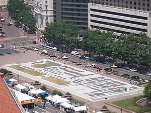 ![]() Looking southeast down Pennsylvania Avenue N.W. in 2006. Freedom Plaza is in the foreground, with its marble inlay of the L'Enfant Plan's 1791 street-grid diagram of Washington, D.C., visible on the ground. The tall building on the left behind the trees is 1111 Pennsylvania Avenue. The Old Post Office Pavilion (former General Post Office for the old United States Post Office Department) is visible to the right, and the United States Capitol is in the far distance to the southeast. | |