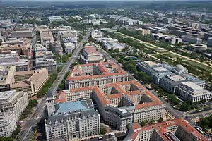 Over the next few years, the President and Congress established several new agencies to supervise the approval, design, and construction of new buildings in the District of Columbia: The Commission of Fine Arts in 1910 (to approve the design of new structures), the Public Buildings Commission in 1916 (to make recommendations regarding the housing of federal agencies and offices), and the National Capital Parks and Planning Commission in 1924 (to oversee planning for the District).[74][75] In the mid-1910s, Congress appropriated and the government spent $7 million to acquire land on Pennsylvania Avenue NW between 14th and 15th Streets NW and several blocks south.[76] But no demolition or construction was conducted, and the government merely collected rent from tenants in the area.[76] In 1924, the Public Buildings Commission recommended that a new series of federal office buildings be built near the White House.[77] The effort saw success in 1926 with the passage by the United States Congress of the Public Buildings Act, which authorized the construction of the Federal Triangle complex of buildings as well as a new U.S. Supreme Court building opposite the United States Capitol, a major extension of the U.S. Government Printing Office building on North Capitol Street, and significant widening of B Street NW on the north side of the National Mall (eventually renamed Constitution Avenue).[74][78][79] The construction of Federal Triangle enabled the Pennsylvania Avenue National Historic Site to become the "monumental core" of the city.[67]
