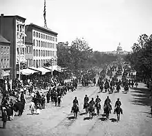 The site has also been the location of major military celebrations. In May 1865, the Army of the Potomac and the Army of the Tennessee marched along Pennsylvania Avenue in a "Grand Review" before newly-sworn President Andrew Johnson in celebration of the end of the American Civil War.[154] More than 200,000 soldiers passed in review.[155] The procession was so massive it took two full days for both armies to pass.[154] Admiral George Dewey, hero of the Battle of Manila Bay during the Spanish–American War, also led a parade up the avenue in 1899 after the United States' victory in that conflict.[156] General John J. Pershing led the American Expeditionary Force in review up Pennsylvania Avenue in 1919 after the conclusion of World War I.[156]