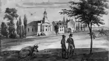 The historic site saw limited growth prior to the 1850s, although a number of "firsts" also occurred in the area. James Greenleaf, an early land speculator in the city, erected the first buildings (six row houses) on Pennsylvania Avenue in the spring and summer of 1794 at the corner of Pennsylvania Avenue NW and 22nd Street NW, and another seven similar buildings were erected about the same time by General Walter Stewart.[31] The "Six Buildings" erected by Greenleaf served as the first headquarters of the United States Department of State and the United States Department of the Navy in 1800, while one of the buildings across the street housed the United States Department of War.[32] Two of the city's first three street lamps were established in the area near Capitol Hill in December 1801.[33]
