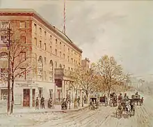 The city's first school, the Western School, opened on the south side of Pennsylvania Avenue between 17th and 18th Streets NW in January 1806.[38] The city's first sewer pipe was laid under Pennsylvania Avenue in 1829.[39] By 1835, Pennsylvania Avenue was largely lined by two- to four-story Federalist row houses.[40] The Baltimore and Potomac Railroad converted a house at the corner of 2nd Street NW and Pennsylvania Avenue into the city's first train station.[41] It was abandoned in 1851 when the station moved to a more long-lasting location at New Jersey Avenue and C Street NW.[42] The same year, the National Theatre opened on December 7.[43] It was followed by the 400-seat Odeon in 1846, the 1,000-seat Adelphi in 1847, and Metzerott Hall in the 1860s.[44] President Andrew Jackson approved the construction of the Treasury Building in 1836 (it was completed the following year), but the size and height of the building forced a rerouting of Pennsylvania Avenue and blocked the view of the White House from L'Enfant's "Grand Avenue."[45] The city's first stock brokerage was opened by William W. Corcoran at 15th and Pennsylvania Avenue in 1837.[46] The city blocks where the National Gallery of Art now stands became a fashionable residential area in the 1830s.[47]
