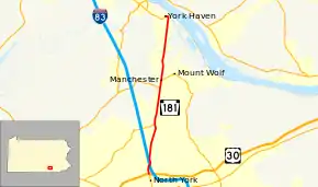 Pennsylvania Route 181 (PA 181) is a 9-mile-long (14 km) north–south state route in York County in south central Pennsylvania. Its southern terminus is at Interstate 83 Business (I-83 Bus.) and U.S. Route 30 (US 30) in North York. Its northern terminus is at the southern terminus of PA 382 in York Haven. PA 181 heads north from US 30 as a four-lane divided highway concurrent with I-83 Bus to an interchange with I-83, where I-83 Bus. reaches its northern terminus. From here, PA 181 continues north as a two-lane undivided road through suburban areas, intersecting PA 238 in Emigsville and PA 921 in Manchester. The route runs through rural land before it comes to York Haven.