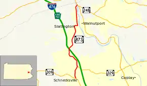 PA 873 begins at an intersection with PA 309 in the community of Schnecksville in North Whitehall Township, Lehigh County, which is in the Lehigh Valley. From this intersection, the route heads north on a two-lane undivided road, passing a mix of homes and businesses. The road turns northeast and passes residences and fields before intersecting the western terminus of PA 329. From here, PA 873 continues north into the residential community of Neffs before curving northwest and entering Washington Township. In this area, the road passes through a mix of housing developments and farmland as it turns north and passes over Interstate 476 (Pennsylvania Turnpike Northeast Extension). The route continues through rural areas of homes and woods prior to crossing into the borough of Slatington. Here, PA 873 becomes Main Street and is lined with residences before reaching the commercial downtown, where the road makes a sharp turn to the east. The route turns north onto Walnut Street and passes more businesses before running past a few homes a short distance to the west of Slatington Airport. PA 873 leaves Slatington for Washington Township again and runs through wooded areas with some residences. The route turns northeast, with the Appalachian Trail joining the road, and crosses the Lehigh River into Lehigh Township in Northampton County, where it passes over Norfolk Southern's Lehigh Line before ending at PA 248 at the base of Blue Mountain south of Lehigh Gap. The Appalachian Trail turns south onto PA 248 at this point.[3][4][5]