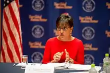 Pritzker was nominated as United States Secretary of Commerce by President Barack Obama on May 2, 2013.[39][40] To avoid conflicts of interest, Pritzker agreed to sell her interest in at least 221 companies and resign from 158 entities, including the Hyatt Board of Directors and the Chicago Board of Education.[lower-alpha 1][43][44][45] Later that month, on May 23, the Senate held its confirmation hearing, which covered a variety of topics. Although Pritzker's family business dealings had been a target of Republican criticism when Obama announced her nomination, only three questions at the hearing related to her family.[46] Pritzker was confirmed by the full Senate on June 25, by a vote of 97 to 1.[lower-alpha 2][47] Pritzker was sworn in as Secretary on June 26, 2013.[48]