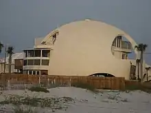 Pensacola Beach is home to several "novelty houses", including the house "Dome of a Home", built in 2002 using a monolithic dome in the form of a large concrete dome, designed to structurally withstand storm surge and hurricane-force winds of 133 metres per second (300 mph). It withstood hurricanes Ivan and Dennis. It is also known as the "Flintstone Home" due to the fact it resembles a rock home.[13]