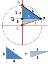 To determine the length of this side, the two right triangles DCM and QCM are depicted below the circle. Using Pythagoras' theorem and two sides, the hypotenuse of the larger triangle is found as . Side h of the smaller triangle then is found using the half-angle formula: