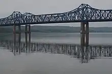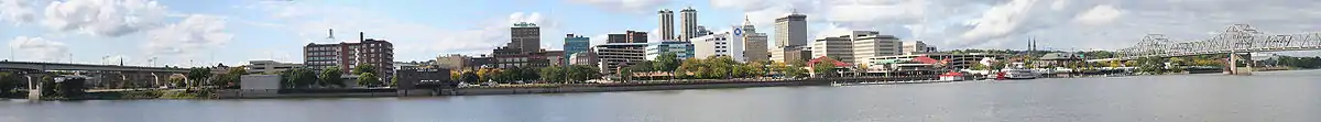 A major port on the Illinois River, Peoria is a trading and shipping center for a large agricultural area that produces maize, soybeans, and livestock. Although the economy is well diversified, the city's traditional manufacturing industries remain important and produce earthmoving equipment, metal products, lawn-care equipment, labels, steel towers, farm equipment, building materials, steel, wire, and chemicals.[9] Until 2018, Peoria was the global and national headquarters for heavy equipment and engine manufacturer Caterpillar Inc., one of the 30 companies composing the Dow Jones Industrial Average, and listed on the Fortune 100; in the latter year, the company relocated its headquarters to Deerfield, Illinois.[10][11]