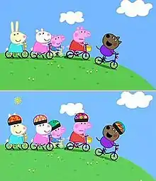 Peppa and her family did not wear seat belts in the first two series. After receiving several complaints, Astley Baker Davies announced that all future animation would include characters wearing seat belts, and that the relevant scenes in the first two series would be re-animated to include them.[14] Similar changes were also made to early episodes with characters riding bicycles to add cycle helmets, which were not included in the original versions.[15]