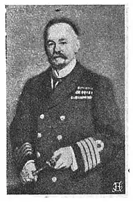Scott was promoted to rear-admiral in 1905[48] and was appointed inspector of target practice, a role created for him by his mentor Jackie Fisher.[49] In 1907 Scott took command of the 1st Cruiser squadron of the Channel Fleet, under the command of Lord Charles Beresford. Because of a forthcoming fleet inspection by Kaiser Wilhelm II, Beresford signalled all ships to abandon any exercises they were currently engaged in, to enable them to be painted and tidied. Scott's ships were in the middle of a gunnery exercise; he lost his temper and sent an insubordinate signal which resulted in a public reprimand.[50] The Kaiser arrived two hours late and did not have time to inspect the fleet.
