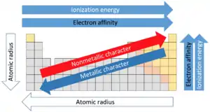 Elements in the same period show trends in atomic radius, ionization energy, electron affinity, and electronegativity. Moving left to right across a period, atomic radius usually decreases. This occurs because each successive element has an added proton and electron, which causes the electron to be drawn closer to the nucleus.[52] This decrease in atomic radius also causes the ionization energy to increase when moving from left to right across a period. The more tightly bound an element is, the more energy is required to remove an electron. Electronegativity increases in the same manner as ionization energy because of the pull exerted on the electrons by the nucleus.[49] Electron affinity also shows a slight trend across a period. Metals (left side of a period) generally have a lower electron affinity than nonmetals (right side of a period), with the exception of the noble gases.[53]