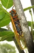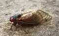 The winged imago (adult) periodical cicada has red eyes and a black dorsal thorax. The wings are translucent and have orange veins. The underside of the abdomen may be black, orange, or striped with orange and black, depending on the species.[6]