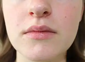 Perioral dermatitis, also known as periorificial dermatitis, is a common type of skin rash. Symptoms include multiple small (1–2 mm) bumps and blisters sometimes with background redness and scale, localized to the skin around the mouth and nostrils. Less commonly the eyes and genitalia may be involved.[2] It can be persistent or recurring and resembles particularly rosacea and to some extent acne and allergic dermatitis. The term "dermatitis" is a misnomer because this is not an eczematous process.[3]