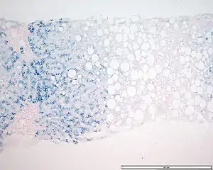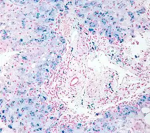 Perls Prussian blue is a commonly used method in histology, histopathology, and clinical pathology to detect the presence of iron in tissue or cell samples.[1][2][3][4] Perls Prussian Blue derives its name from the German pathologist Max Perls (1843–1881), who described the technique in 1867.[2] The method does not involve the application of a dye, but rather causes the pigment Prussian blue to form directly within the tissue.[5] The method stains mostly iron in the ferric state which includes ferritin and hemosiderin, rather than iron in the ferrous state.[6]