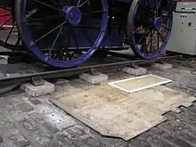 The earliest use of a railway track seems to have been in connection with mining in Germany in the 12th century.[2] Mine passageways were usually wet and muddy, and moving barrows of ore along them was extremely difficult. Improvements were made by laying timber planks so that wheeled containers could be dragged along by manpower. By the 16th century, the difficulty of keeping the wagon running straight had been solved by having a pin going into a gap between the planks.[3] Georg Agricola describes box-shaped carts, called "dogs", about half as large again as a wheelbarrow, fitted with a blunt vertical pin and wooden rollers running on iron axles.[4] An Elizabethan era example of this has been discovered at Silvergill in Cumbria, England,[5] and they were probably also in use in the nearby Mines Royal of Grasmere, Newlands and Caldbeck.[6] Where space permitted round-section wooden tracks to take trucks with flanged wheels were installed: a painting from 1544 by the Flemish artist Lucas Gassel shows a coppermine with rails of this type emerging from an adit.[7]