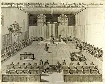 The Perpetual Diet of Regensburg[1] or the Eternal Diet of Regensburg[2][nb 1] (German: Immerwährender Reichstag) was a session of the Imperial Diet (Reichstag) of the Holy Roman Empire that sat continuously from 1663 to 1806 in Regensburg in present-day Germany.[2] Previously, the Diet had convened in different cities but, beginning in 1594, it met only in the town hall in Regensburg. On 20 January 1663, the Diet convened to deal with threats from the Ottoman Empire (the Turkish Question).[2] Since the Peace of Westphalia in 1648, the Holy Roman Emperor had been formally bound to accept all decisions made by the Diet. Hence, out of fear that the Emperor would disregard the Diet's role by not calling sessions,[3] it never dissolved and became a perpetual diet. Therefore, no final report of its decisions, known as a Recess, could be issued, and that of the preceding diet, issued in 1654, was dubbed the Youngest Recess.[4] From 1663 until the 1684 Truce of Ratisbon (a former name of Regensburg in English), the diet gradually developed into a permanent body.[2]