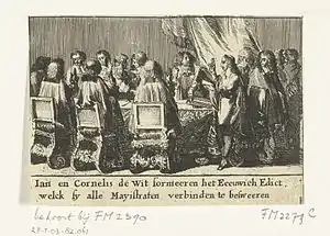 To this proposal an addendum was added by Gaspar Fagel, then Pensionary of Haarlem, Gillis Valckenier and Andries de Graeff, two prominent Amsterdam regents, which abolished the stadtholderate in Holland "for ever."[1] The new law, entitled "Perpetual Edict ... for the Preserving of Freedom" was enacted on 5 August 1667. The three main points were abolition of the stadtholderate, permanent separation of the offices of captain-general of the Union and stadtholder (in all provinces), and the formal transfer of the prerogatives of the Stadtholder of Holland to the provincial States (confirming the transfer that had provisionally been made in December 1650, after the death of William II of Orange).[2]