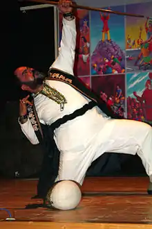 Siah-Bazi, also known as Siyah-Bazi is a type of Iranian folk performing art that features a blackface, mischievous and forthright harlequin that does improvisations to stir laughter.[6] The term Siah-Bazi literally translates to "playing black" and is a sketch in which two men dressed in red turbans, one has black face paint and they engage in a verbal duel which is often witty, political in nature and humorous.[7][8] The character with the black face takes on a clown-like role and tries to disgrace the master. Outwardly the master appears to be a respectable person but underneath he is immoral and not to be respected.[9] The blackface character is portrayed as a carnivalesque underdog of the working class and the audience can empathize with their struggle through humor.[10] Siah-Bazi has been compared to American minstrel theater and have similar controversy.[10]