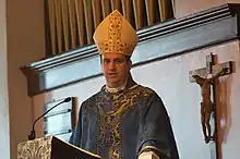 The ordinary of a personal ordinariate is canonically equivalent to a diocesan bishop, and thus wears the same ecclesiastical attire and uses the same pontifical insignia (mitre, crosier, pectoral cross, and episcopal ring) as a diocesan bishop even if he is not a bishop.[13] The ordinary is also, ex officio, a full member of the episcopal conference(s) of the territory of the ordinariate.[12]