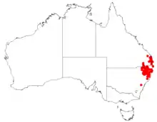 This persoonia grows in woodland and forest north from the Moonbi Range in north-eastern New South Wales and in south-eastern Queensland.[2][7]