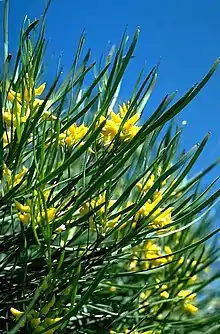 Persoonia stricta is a species of flowering plant in the family Proteaceae and is endemic to the south-west of Western Australia. It is an erect, spreading shrub with smooth bark, linear to spatula-shaped or oblong leaves, and bright yellow flowers borne in groups of four to twenty-five on a rachis 3–100 mm (0.12–3.94 in) long, each flower with a leaf or scale leaf at its base.
