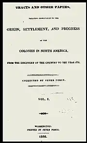 Force's greatest achievement came as a collector and editor of historical documents. He published Tracts and Other Papers, Relating Principally to the Origin, Settlement, and Progress of the Colonies in North America (4 vol Washington, 1836–1846), which comprised rare pamphlets. His nine volume American Archives, published at intervals from 1837 to 1853, was a collection of the most important documents of the American Revolution, 1774–1776.[1][27]