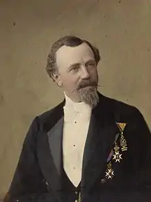 In 1846, Peter Petersen received his burghership in Christiania, and took over his father's dry goods store, including the building at Karl Johans gate 16.[1] The company was later named Peter Petersen & Co, and expanded considerably.[3] While running this company, Petersen also forayed into other branches of enterprise.[1] He became manager of the textile manufacturer Nydalens Compagnie in 1858 and served as such until 1889. He was also chairman of the board from 1868 to his death in 1896.[4] He also founded Christiania Mekaniske Væveri in 1847 together with Iver Olsen and the Nydalens Compagnie associates Adam Hiorth, Hans Gulbranson and Oluf Nicolai Roll,[5] and was among the owners of Grorud Kledefabrikk.[3] He chaired the traders' interest group Christiania Handelsstands Forening from 1874 to 1880 and 1882 to 1886, and later became an honorary member. He was appointed Austrian consul in 1866, and consul general for the Austro-Hungarian Empire in 1874.[1]
