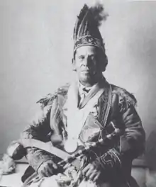 He was named Kahkewāquonāby by his maternal grandfather, Chief Wahbanosay, during a dedicated feast. A son of Wahbanosay's who had died at age seven had been given the same name.[10] The name translates into English as "[sacred] waving feathers" and denotes feathers plucked from the eagle, which was sacred to the Mississaugas. This put him under the guardianship of the Mississauga's animikii (thunderbird) manidoo, as the eagle represented this manidoo. His mother was of the Eagle totem and the name belonged to that totem. At the feast Kahkewāquonāby was given a club to denote the power of the thunder spirit, and a bunch of eagle feathers to denote its flight.[11]