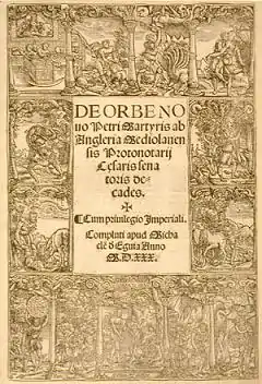 Peter Martyr d'Anghiera (Latin: Petrus Martyr Anglerius or ab Angleria; Italian: Pietro Martire d'Anghiera; Spanish: Pedro Mártir de Anglería; 2 February 1457 – October 1526), formerly known in English as Peter Martyr of Angleria,[1] was an Italian historian at the service of Spain during the Age of Exploration. He wrote the first accounts of explorations in Central and South America in a series of letters and reports, grouped in the original Latin publications of 1511 to 1530 into sets of ten chapters called "decades." His Decades are of great value in the history of geography and discovery. His De Orbe Novo (On the New World, 1530) describes the first contacts of Europeans and Native Americans, Native American civilizations in the Caribbean and North America, as well as Mesoamerica, and includes, for example, the first European reference to India rubber. It was first translated into English in 1555, and in a fuller version in 1912.