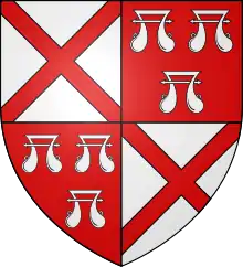 Arms of Baron de Ros of Helmsley: Quarterly, 1st and 4th: Argent, a saltire gules (for Fitzgerald) 2nd and 3rd: Gules, three water bougets argent (for de Ros)[1]