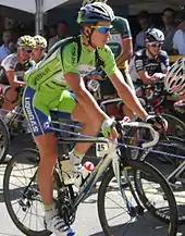 In 2013, Sagan's team changed its name to Cannondale, since Liquigas ended its cycling sponsorship after eight years.[56] Sagan started his season at the Tour de San Luis, coming close to success in the last stage by finishing second behind Mattia Gavazzi.[57] He took his first victory of the season on the second stage of the Tour of Oman. Sagan broke away from a group of chasers in the final kilometres, joined three escapees but continued his effort to bank a solo win.[58] He won again the very next day on a stage that featured the same course as stage 2 of the 2012 edition, which he had won as well.[59] Before the start of stage 5, Sagan announced his withdrawal due to bronchitis.[60] He scored a victory in his very first comeback race, the Gran Premio Città di Camaiore by out sprinting a group of twelve riders.[61] He finished second at Strade Bianche, while his teammate Moreno Moser won the event. Sagan covered the late break attempts to help Moser's bid for victory, then attacked himself to complete a one-two for Cannondale.[62] He went on to win stages 3 and 6 of Tirreno–Adriatico. On stage 3, he out sprinted Mark Cavendish and André Greipel in pouring rain after his team accelerated the race's speed on a small climb nearing the finish.[63] On stage 6, Sagan survived a climb featuring a section at a slated 30% incline, and formed a breakaway with former teammate Vincenzo Nibali and Joaquim Rodríguez. He beat both to the sprint.[64]