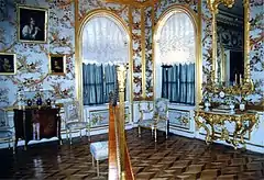 The East and West Chinese Cabinets were decorated between 1766 and 1769 to exhibit objects of decorative art imported from the East. The walls were decorated with imitation Oriental patterns by Russian craftsmen, and hung with Chinese landscape paintings in yellow and black lacquer. Another room, positioned at the centre of the palace, bears the name of the Picture Hall. Its walls are almost entirely covered by a series of 368 paintings, mostly of variously dressed women, differing in appearance and even age, yet most were drawn from a single model. These were purchased in 1764 from the widow of the Italian artist P. Rotari, who died in St. Petersburg.