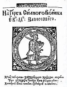 Petro Konashevych-Sahaidachny (Ukrainian: Петро Конашевич-Сагайдачний; Polish: Piotr Konaszewicz-Sahajdaczny; born about 1582[2] in Kulchytsi, today Sambir Raion – April 20, 1622 in Kyiv) was a Ukrainian political and civic leader, Hetman of Ukrainian Zaporozhian Cossacks from 1616 to 1622,[2] a brilliant military leader of Polish–Lithuanian Commonwealth both on land and sea. While being a Cossack Hetman, he transformed the Cossack Host from the erratic military formation into regular army. Under his leadership the cossacks, the Orthodox clergy and peasants had been begun to emerge as the united nation. His troops played a significant role in the battle of Khotyn against the Turks in 1621 and prince Władysław's attempt to gain the Muscovy throne in 1618.[3]