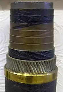 The PWD worked on a flamethrower for the Churchill infantry tank.[130] Work was initially slow because priority was given to the Wasp and there is a suggestion that early work on the Crocodile was unofficial.[131][132] The first prototype was completed early in 1942 and a report by the Royal Armoured Corps stated that the Crocodile was not a requirement of the General Staff but that PWD was hoping that a demonstration in the near future would change minds.[132] The design drew upon experience with the Valentine tank prototypes.[132] Fuel and pressure for the flamethower was carried in a trailer with 0.47 in (12 mm) of armour and as a result weighing about 6.4 long tons (6.5 t).[132] The trailer held two fuel tanks with a capacity of 400 imp gal (1,800 l) and five compressed-air cylinders plus some ancillary piping and a hand pump for filling.[132] The trailer had two wheels fitted with run-flat tyres but no shock absorbers or brakes.[133]