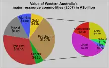 In 2007, the industry produced 126 million barrels (20,000,000 m3) of crude oil/condensate, and 30 billion cubic metres of gas. 65% of the gas was transformed into 12 million tonnes of LNG (all of which was exported), with the remainder of the gas being sold to users in Western Australia.[3] Primary production by the industry was valued at $16.7 billion, accounting for 31% of all natural resources produced in the state.[4]