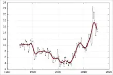 Oil production in Australia increased gradually after 1980, peaking in 2000 at 805,000 barrels per day (128,000 m3/d). In 2003, production fell dramatically to 630,522 bbl/d (100,245.0 m3/d). In 2006, Australia produced approximately 562,000 bbl/d (89,400 m3/d) of oil.[14]