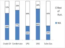 In 2006-07, around two thirds of Australia's natural gas was produced in the Carnarvon Basin off the coast of Western Australia.[3] Most of the gas produced in WA is transformed into liquefied natural gas (LNG) and exported to Japan. The remainder is used within the state. The domestic market for natural gas in WA, like that of Australia as a whole, is characterised by a small number of producers and a small number of large industrial consumers, with limited depth in consumption.[3]