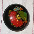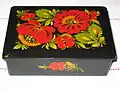 Ornamental painting on walls and on paper were common in many villages of the Dnipropetrovsk area, but were most prevalent and highly developed in the village of Petrykivka, from which the style takes its name.[4] Mural decoration of homes have existed in Petrykivka from at least 1860, and works on paper - from the late nineteenth century.[5] From the time of the New Sich in the mid-1700s until the middle of the nineteenth century, these lands were primarily populated by settlers from the Poltava and Sloboda regions, and it is possible that these migrants brought this painting tradition to Petrykivka.[5] No descriptions of wall decoration exist for the Poltava area in the nineteenth century, but there were reports of mural decoration in the Sloboda region, such as from 1860 in the Kupians’k area of Kharkiv province.[5] Therefore, it has been proposed that the Petrykivka tradition originated from the Sloboda region.[5] However, there also exist boxes with decorative floral painting from Poltava dating from the second half of the nineteenth century.[6] Yet another alternative hypothesis is that this painting style came from Podillia via Uman’. However, murals with floral ornaments appeared there only much later.[4]